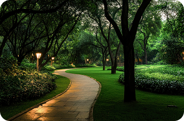Meditation zone, gardens, play area, pet park, and temple for a peaceful life.